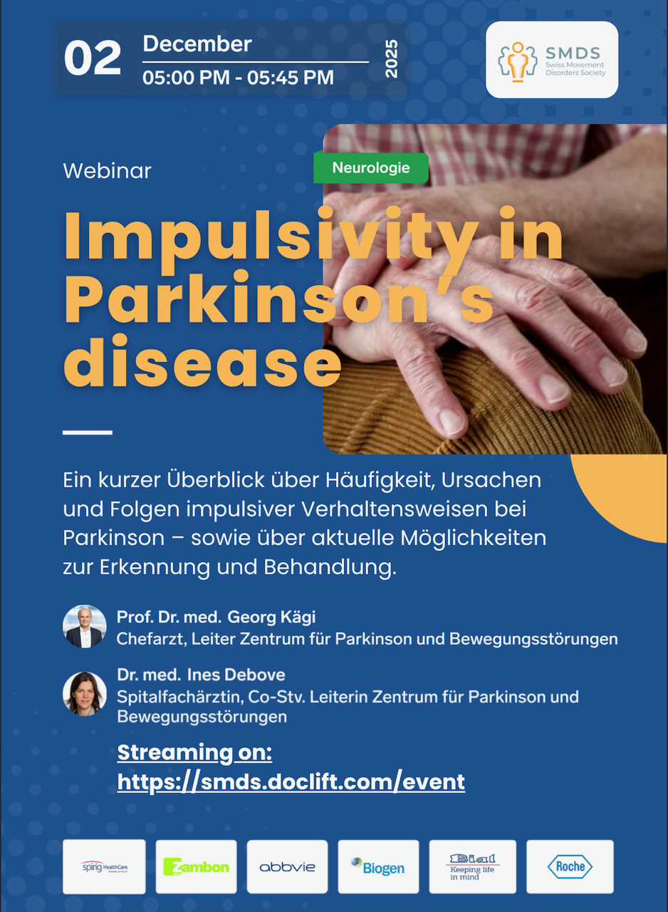 La Swiss Movement Disorders Society (SMDS) invita i suoi membri al primo webinar della società. L’evento online si terrà martedì 2 dicembre 2025 alle 17:00 e tratterà il tema centrale dell’impulsività nei pazienti affetti da Parkinson.